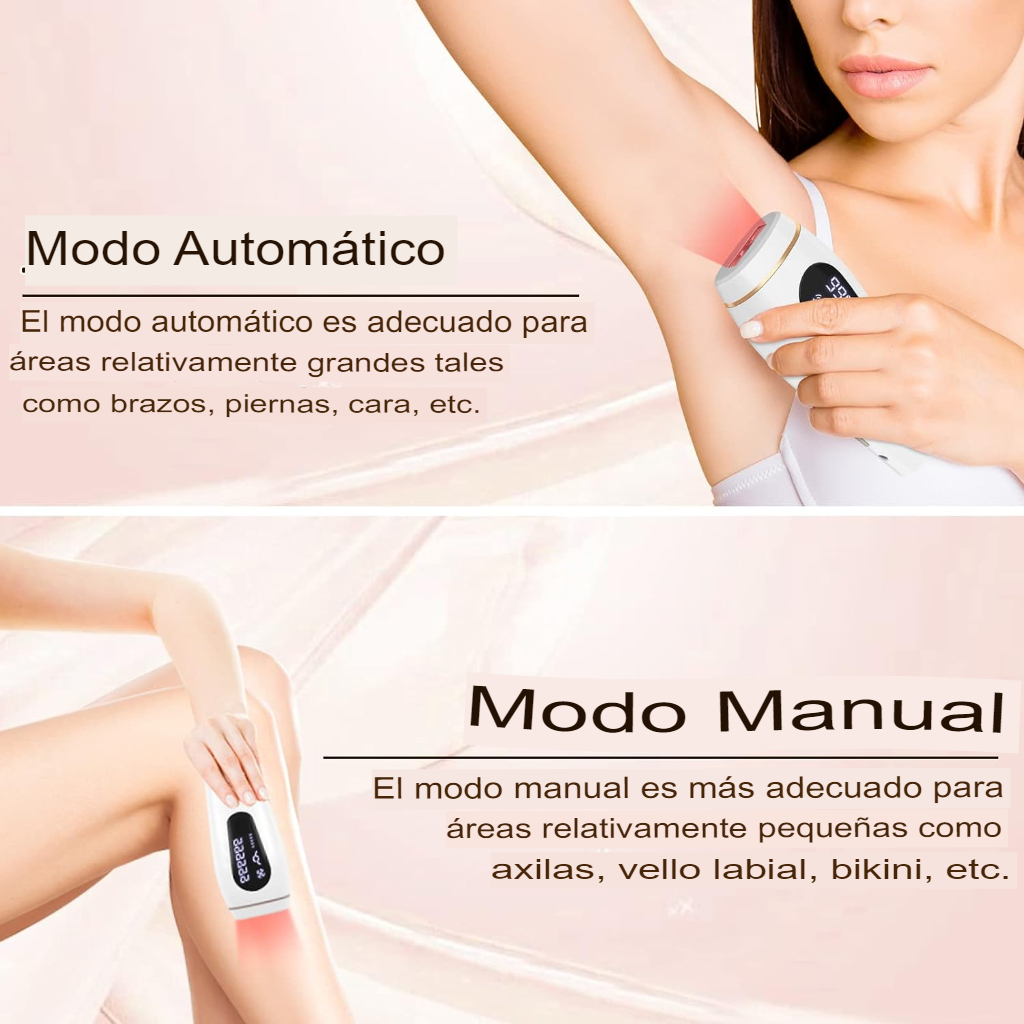 - Modos manuales y automáticos: la depilación facial para mujer está diseñada con dos modos de operación para satisfacer tus necesidades en diferentes áreas de depilación. El modo manual es principalmente para depilaciones en áreas pequeñas, como líneas de bikini, axilas y labios; el modo automático se puede utilizar para la depilación de áreas grandes, como brazos, piernas y espalda